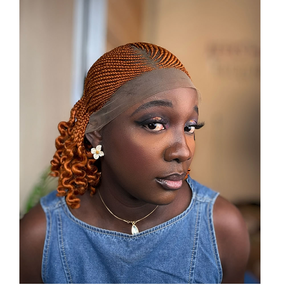 This is a full lace wig with hand-crafted cornrows that transition into soft, bouncy curls. You get a natural-looking hairline, so you’re not spending extra time trying to make it look real. It already does. The ginger color is warm and vibrant – it complements deeper skin tones beautifully and catches light skin tone in a way that just works. Not too bright, not too subtle. Just right.