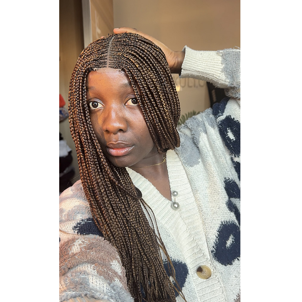 This gorgeous closure braided wig features a sleek side-part lace closure that flows seamlessly into long, beautifully hand-crafted small to medium box braids. This wig truly embodies richness with its effortless elegance and realistic finish.